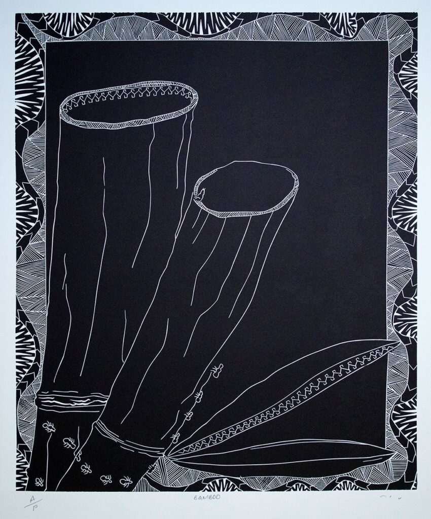 The artwork is a B/W lino print, printed on BFK Rives paper (100% cotton rag with strong archival properties).